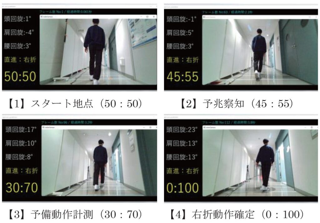 生活空間へのロボットやセンサの導入に際し、安全性および快適性確保のため、人の動作を予測するシステムが必要となっています。計測対象となる日常生活動作の中でも、歩行中における方向転換動作は高頻度かつ転倒リスクが指摘される難易度の高い動作として知られています。